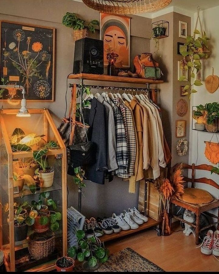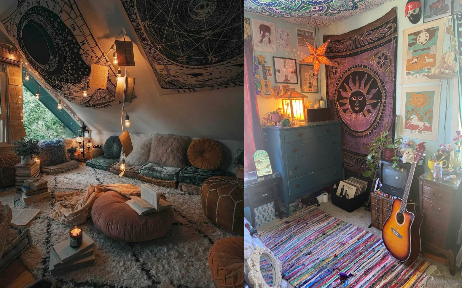 Стены украшаются картинами, вьющимися растениями, ловцами снов или макраме. Винтажные плакаты и виниловые диски вызовут ностальгию и перенесут тебя в прошлое: знаменитый рок-фестиваль “Вудсток”, палаточные лагеря, дорога, преодолеваемая на магическом автобусе, пабы и бары Сан-Франциско, встречи с такими же хиппарями…